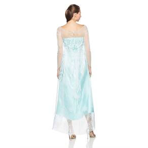 Frozen é um filme estadunidense de 2013, do gênero comédia musical animado por computador, produzido pelos estúdios de animação Walt Disney e lançado pela Walt Disney Pictures. O filme conta a história de uma princesa destemida que parte em uma jornada épica ao lado de um homem da montanha robusto e em busca de emoção, suas leais renas de estimação e um infeliz boneco de neve para encontrar sua irmã distante, cujos poderes gelados inadvertidamente aprisionaram o reino no inverno eterno. Este traje de luxo Elsa apresenta um belo vestido azul com mangas grossas, corpete de lantejoulas e uma sobreposição com flocos de neve brilhantes, redemoinhos e gelo