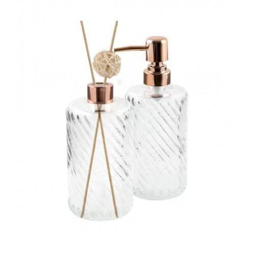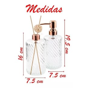sabe aquele seu aroma preferido lavanda, chá verde, limão, aloe vera, escolha, coloque no recipiente e mergulhe as varetas para aromatizar a sala, banheiro, cozinha, quarto, todos os ambientes. No dispenser pode colocar álcool gel, hidratante, sabonete, o que você quiser. Marca: mimo style vidro espiral e tampas em rose gold medidas: 19,5cm x 8cm x 15,5cm cada capacidade 450ml cada
