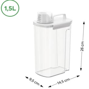 Garantia: 3 meses / Peso: 0,310kg / Cor predominante: transparente / Ref: 102463009 Dimensões: 9,5cm (C) x 14,5cm (L) x 26cm (A); Capacidade do medidor: 90ml; Capacidade do pote: 1,5 litros; Cuidados: para garantir a durabilidade evitar quedas, higienizar de forma correta para evitar desgaste; Material: polietileno, polipropileno e pet; Conteúdo: 1 dispenser com medidor;
