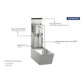 Para garantir sua higiene e dos frequentadores dos seus ambientes, conte com o dispenser de álcool gel e sabão líquido Tramontina em aço inox com acabamento escovado. Com capacidade de 500 ml, conta com um design exclusivo que permite a colocação nos ambientes mais variados, sejam corporativos ou comerciais. Sua fabricação é em aço inox com acabamento escovado, material que é muito resistente e durável!