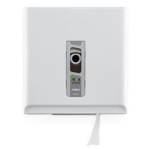 Instalação: pressione o botão para abrir. Abra com cuidado, puxando a parte frontal para a frente e para baixo. Fixe o dispensador na parede utilizando os parafusos que o acompanham. Abasteça com papel interfolhas, feche o dispensador e pronto