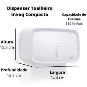 Dispenser de papel interfolha invoq compacto branco Feito com materiais resistentes, duráveis e com acabamento de alto padrão. O toalheiro invoq compacto torna-se peça-chave na composição de um ambiente moderno, clean e requintado. Informações técnicas: - fabricado em abs de alta resistência ao impacto - processo de produção por injeção termoplástica - sistema de fechamento inteligente - espaço interno com todas as paredes revestidas que garantem mais higiene evitando umidade e poeira. - visor transparente que permite a visualização do conteúdo, facilitando o abastecimento Especificações: Capacidade: 380 folhas Peso aproximado do produto: 0,410 kg Marca: premisse Modelo: invoq compacto Medidas: (a) 15,5 cm x (l) 24,4 cm x (p) 12,8 cm - instruções de instalação: verifique o local a ser instalado. Limpe a área com álcool, retire o liner protetor da fita e coloque o dispenser na parede pressionando-o levemente. Espere 24 horas para fixação completa antes de abastecê-lo. Para fixação em locais úmidos (banheiros, por exemplo), em paredes porosas ou com acabamento desgastado, recomendamos a utilização de buchas e parafusos para instalação do dispenser. Nestes casos, esteja atento às redes hidráulicas e elétricas.