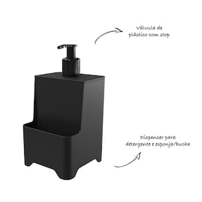 Dispenser de Pia para Detergente e Esponja - Stolf Preto - Dispenser de Pia para Detergente e Esponja espaço para o detergente e esponja de louça, produzido em plástico polipropileno. Características Gerais do Produto: Características: Capacidade de 650ml - Porta esponja - Válvula com trava Cor: Branco; Preto; Vermelho; Cinza; Areia Itens Inclusos: Dispenser para detergente Medidas: 18 cm x 10 cm x 9,5 cm Fabricante: Stolf Material: Plástico Polipropileno : Sem
