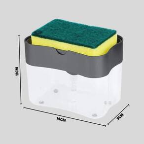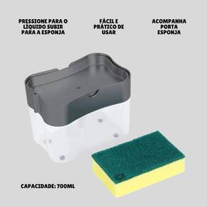 Principais características: - Dispenser 2 em 1: armazena detergente e possui porta esponja integrado. - Capacidade de até 700ml de detergente. - Dosador por pressão para evitar desperdícios. - Mantém a esponja seca para uso futuro. - Feito de Plástico Polipropileno resistente.