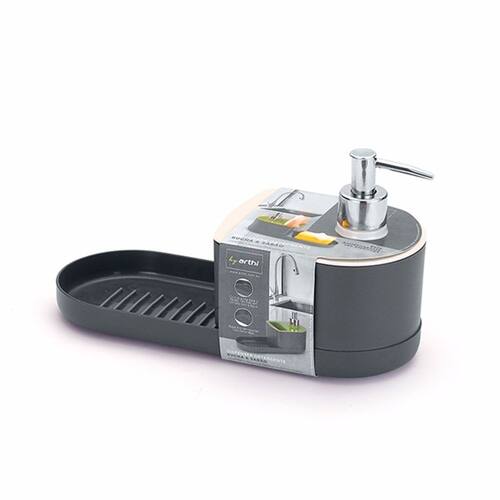 Descrição: contém: 01 Dispenser Detergente,bucha E Sabão Pratico e funcional produto para sua pia. Num único produto, comporta detergente liquido, bucha e sabão em pedra. O compartimento de sabão em pedra tem a base antiderrapante, evitando que o sabão escorregue. Composição: Polipropeno. Medidas:c 24,5 x L 10 x A 14 cm