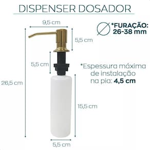 Aliando modernidade e elegância o Dosador Dourado é o produto ideal para compor seu ambiente, adiciona requinte a sua bancada com o seu design polido propiciando uma aparência inovadora e discreta com muita eficácia no seu uso. Sua instalação é fácil, ele é o Dispenser ideal para colocar ao lado da sua pia ou torneira, é preciso apenas preparar a superfície com um furo vazado e embutir seu dosador. Funcional, sua utilização é bem prática, o refil pode ser completo sempre que se esgotar, sem exigir muito trabalho, é necessário apenas retirar a parte superior do aplicador e preenche-lo com sua solução.