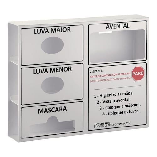 Dispenser Epi - Hospitalar Luva Máscara Avental RamebelModelo exclusivo de encaixe de embalagem de luvas, máscaras e aventais. Use diretamente no suporte.Possibilidade de fabricação de modelos de Dispensers personalizados.Acompanha kit para fixação na parede, contendo: bucha, parafuso e fita dupla-face.Indicados para armazenar Equipamentos de proteção individual de uso único.Mantém a organização e praticidade.+ Segurança+ Organização+ Praticidade+ Visibilidade