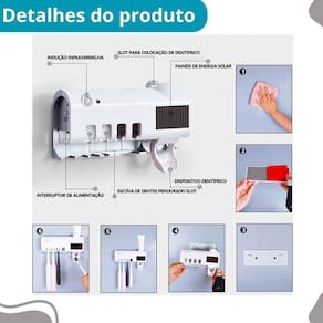 Dispenser esterilizador de escovas usb Descrição do anúncio: O porta escova de dentes suporte de pasta automático e esterilizador uv da solar é uma solução avançada para manter suas escovas de dente livres de bactérias. Utiliza tecnologia uv e fotocatalisador, eliminando 99,9% dos micro-organismos. Com carregamento solar e por usb, seu sistema de bomba de vácuo evita desperdício de pasta de dente.