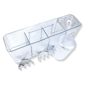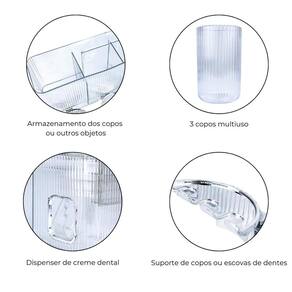 O organizador multiuso perfeito para o seu banheiro Composto por um dispenser de pasta de dente, onde é possível encaixar a a pasta e apertar com a própria escova de dente em uma abertura de clique do dispenser e assim despejar a quantidade de pasta que preferir. Composto por 3 copos acrílicos multiuso, que podem ser utilizados para enxaguar a boca, serem porta objetos da pia, organizadores e muito mais O organizador possui 3 aberturas, ou para os copos ou para cosméticos e itens em geral, abaixo do organizado são encaixados três ganchos prateados para colocar os copos, ou para organizar escovas de dentes, acompanha um adesivo de fácil aplicação na parte de trás do produto, para que seja colado na parede, feito de alta qualidade, não permite que o organizador se descole. Sei design é neutro, feito de acrílico transparente com alguns detalhes em relevo e detalhes prateados em plástico.