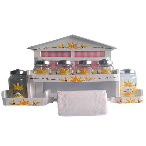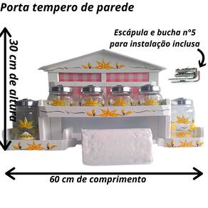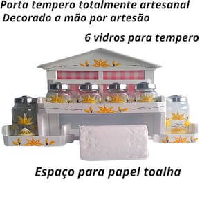 Suporte Para Papel Toalha E Condimentos Com 6 Vidros Lindos porta tempero artesanal com 06 vidros para tempero e espaço para papel toalha Produzido de modo totalmente artesanal decorado a mão Produzido em madeira maciça ( DE LEI ) ecologicamente correta com pintura esmaltada para proporcionar fácil limpeza, os potes para tempero são de vidro, tampa de alumínio com trava. Cabe 1 papel toalha São 4 potes com a capacidade de 220 ml e 2 vidros com a capacidade de 500 ml de capacidade Medidas do suporte: 12 cm de largura 60 cm de comprimento 30 cm de altura