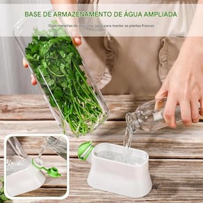 O recipiente é fácil de utilizar, basta despejar água filtrada ao dispenser de ervas através da tampa removível e verifique se as hastes estão submersas para uma eficácia máxima. Esse recipente pode manter as ervas frescas por até 3 semanas, permitindo que você coma vegetais frescos a qualquer momento. É ideal que troca da água do recipiente a cada 3-5 dias.