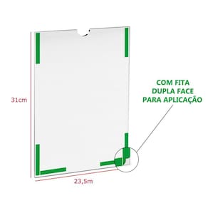 Envio de imediato após a confirmação do pedido Modelo simples de parede sem o filete espaçador nas laterais e sem fundo. Acomoda apenas 1 unidade da folha a4, onde a base é a própria parede ou porta, todas as unidades com fita dupla face de alta fixação. O produto não tem os filete espaçador nas laterais e que a fita dupla face é direto no acrílico, modelo sem o filete espaçador. Fita dupla face de alta fixação colada diretamente na placa a4. Display de parede porta folha a4 vertical Suporte de papel para porta folha e folheto a4 é o produto ideal para exposição de cartazes, anúncios, comunicados, certificados, alvarás, licenças, suportes para notificações, ofertas e qualquer tipo de comunicação entre você e seus clientes ou funcionários. Onde utilizar seu display Nossos displays são perfeitos para uso interno e possuem excelente durabilidade e visibilidade do cartaz ou folheto aplicado. O display transparente torna-se a opção mais viável para fazer divulgações de anúncios e avisos por sua praticidade. Seja público interno ou clientes as informações precisam estar bem posicionadas para melhor visibilidade, e com nosso display de parede você conseguirá isso facilmente. Características: - peça fabricada com corte a laser. - não amarela com o tempo. - excelente resistência e durabilidade. - fita dupla face nas bordas laterais para fixação. Informação de uso e instalação: Use pano úmido na superfície onde o display será colocado, tire a proteção verde da fita dupla face, cole o produto na superfície. O produto pode ser e fixado no formato vertical ou horizontal. A peça é a mesma, se quiser usa-la no formato vertical e só instalar e fixar ela na parede ou na porta em pé ou se quiser usa-la no formato horizontal e só instalar e fixar ela na parede ou na porta deitado. Dados técnicos: Modelo: display de parede com fita dupla face Tamanho: porta folha a4 Material: acrilico Uso: vertical ou horizontal. Tamanho: Largura: 22 centímetros. Altura: 32 centímetros. A acrilzano, fábrica de acrílico com mais de 26 anos no mercado, prioriza transmitir a individualidade em suas peças acrílicas aliada a altos critérios de qualidade. Cuidados com os produtos acrilzano: A limpeza deve ser feita sempre com um pano macio ou flanela a fim prolongar a vida útil do material. Não usar esponjas ou materiais de fricção. Enviamos para todo brasil com embalagem resistente e segura. Marca: Não Informado