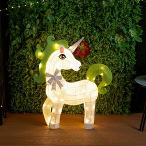 - Decoração encantadora de unicórnio: eleve seu espaço com este extravagante unicórnio 3D, com corpo de tecido branco com cabeça e cauda verdes e medindo 30" L x 6" L x 35" H, com 60 luzes LED brancas quentes para uma exibição mágica em ambientes internos ou externos.