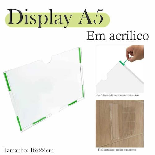 Tamanho do display: 16 Cm de altura X 22 Cm de largura Cor: Transparente Espessura: 2 mm Qualidade: Virgem