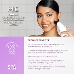 MIO é um dispositivo de microdermoabrasão recomendado por dermatologistas que usa as propriedades de rejuvenescimento da pele de brocas de diamante e sucção a vácuo para ressurgir a pele, dando a você resultados de qualidade  em casa que deixam sua pele incrivelmente mais suave e macia. A ponta de rejuvenescimento da MIO esfolia e dá brilho à pele para suavizar áreas ásperas e secas e tom de pele irregular, melhorando a aparência das linhas finas e rugas. As pontas de extração de sucção ajudam a atingir áreas congestionadas da pele para purificar e minimizar os poros. Revele o verdadeiro potencial da sua pele à medida que nossa tecnologia avançada remove de forma suave e eficaz a pele morta e a textura áspera. Experimente suavidade melhorada, suavidade, brilho, linhas finas reduzidas e um tom de pele mais uniforme. Poros dilatados serão coisa do passado. Descubra o conforto e a facilidade do sistema de microdermoabrasão Spa Sciences com seu inovador cabo ergonômico. Nosso design elegante, combinado com tecnologia patenteada de resurfacing da pele e 5 configurações de velocidade ajustáveis, garante uma experiência perfeita enquanto trata seu rosto. MIO oferece tudo o que você precisa para voltar no tempo para sua pele e revelar um brilho saudável e vibrante. Os usuários podem esperar uma pele mais macia e suave após a primeira sessão. Após 8 a 12 semanas de tratamentos semanais, os resultados incluem redução das linhas finas e rugas, maior hidratação e redução no tamanho dos poros e até mesmo o tom da pele.