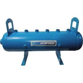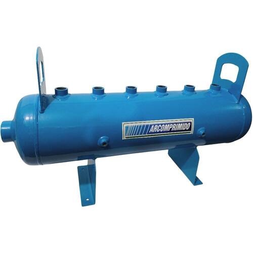 Distribuidor de ar comprimido DH25-6 (mod.1) com 02 conexões nas calotas, 01 de 2'' e 01 de 1". 06 saídas superior de 1". Luvas laterais para acessórios de segurança (manômetro e válvula de segurança) de 1/4'' e luva inferior de 1/4'' (dreno). Pressão máxima de trabalho 12,3kg/cm. Dimensões; Altura: 575 mm, Comprimento total: 1030 mm, Diametro corpo: 180 mm, Altura total com alça de movimentação: 575 mm. Acompanha documentação com certificado de teste hidrostático. **Este anúncio não contempla os acessórios de segurança (manômetro, válvula de segurança e dreno - necessários para uso) - podendo ser adquiridos separadamente. **O descritivo do anúncio pode ser adaptado com bujões e reduções**
