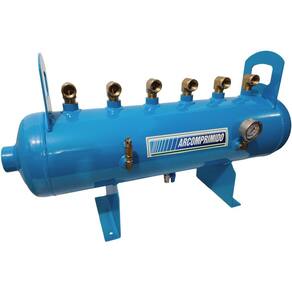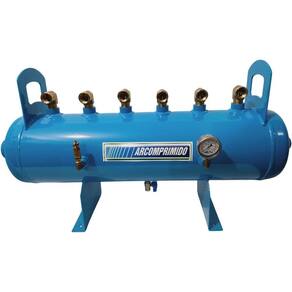 Distribuidor de Ar Industrial DH25-6 (mod.1) com 02 conexões nas calotas, 01 de 2'' e 01 de 1". 06 saídas superior de 1". Luvas laterais para acessórios de segurança (manômetro e válvula de segurança) de 1/4'' e luva inferior de 1/4'' (dreno). Pressão máxima de trabalho 12,3kg/cm. Dimensões; Altura: 575 mm, Comprimento total: 1030 mm, Diametro corpo: 250 mm, Altura total com alça de movimentação: 575 mm. Acompanha documentação com certificado de teste hidrostático. Acompanha os acessórios de segurança manômetro, válvula de segurança e dreno Manual - necessários para uso. Acrescentado cotovelo Macho-Fêmea de 1'' NPT.