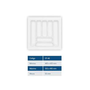 Características Divisor organizador de talher para gaveta og-40 branco. 7 divisórias. Obs: caso queira cortar você mesmo, as indicações dadas pela loja é que vire a peça do lado oposto e com o estilete e auxílio de um régua marcar e corta-lo até destacar para que se parta. O divisor organizador de talher para gaveta og-40 branco contem 7 divisórias que organiza de forma adequada os seus talheres e utensílios. Dimensão máxima : Comprimento: 49,5 cm Largura: 55,5 cm Altura: 5,5 cm Dimensão mínima : Comprimento: 43,5cm Largura: 49,5 cm