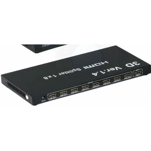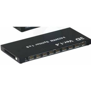 Divisor Splitter Hdmi 1x8 Saidas - 1080p 1.4 3d Distribuidor de Video Splitter HDMI 1 x 8 . Suporta de 480i à 1080i/p FULL HD. Suporta 3d DHMI Splitter Características: Conecta até quatro HDMI tm ao mesmo tempo a uma fonte de vídeo Permite a visualização simultânea Mantém vídeo de alta resolução - ótima resoluções nítidas HDTV até 1080p, 2k, e resoluções de computador de até 1920 x 1200 são facilmente alcançados Compatível com HDMI 1.3 e 1.4 HDMI tm compatível Compatível com HDCP Especificações: Vídeo Banda Amplificador: 4.95 GHz Vídeo Sinal de entrada: 1,2 volts p-p Entrada de Sinal DDC: 5 volts p-p TTL Single Link Faixa: 1080p/60 profundidade de cor de 10 bits, 1920x1200. HDMI Conector: tipo A 19 pinos fêmea Fonte de alimentação: 5VDC Consumo de energia: 10 watts máximo Marca: Jc Cabos Ean: 7896207513848