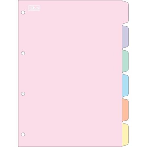 Divisoria para fichario universitario pastel escolar tilibra Divisória para fichário universitário pastel académie tilibra com 6 divisórias São 6 divisórias diferentes, ideais para a organização e separação de matérias nos cadernos argolados. As divisórias possuem impressão nas cores rosa, lilás, verde, azul, laranja e amarelo. Informações do produto: Marca: tilibraLinha: academieDivisórias: decoradasMaterial: cartãoProduto certificado: fscFormato: 210mm x 290mmGramatura: 250 g/mNúmero de folhas: 6 folhasCód: 316881
