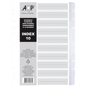 Divisória Plástica A4 Acp 10 Projeções Transparente As divisórias transparentes ACP com furação universitária são perfeitas para organizar seus documentos de forma eficiente. Com 10 divisões, você pode separar seus materiais por assunto, disciplina ou projeto. Compatíveis com diversos modelos de fichários e pastas, elas são essenciais para quem busca organização e praticidade. Pode ser em nossos fichários, fichários personnalité, pastas com grampo plástico, pastas com canaleta. Contém - 10 divisões - Marca: Acp - Modelo: Universitária - Referência: 655 - Transparente - Tamanho: A4 215 x 297mm - Composição: Polipropileno Marca: Não Informado Ean: 7897027220350