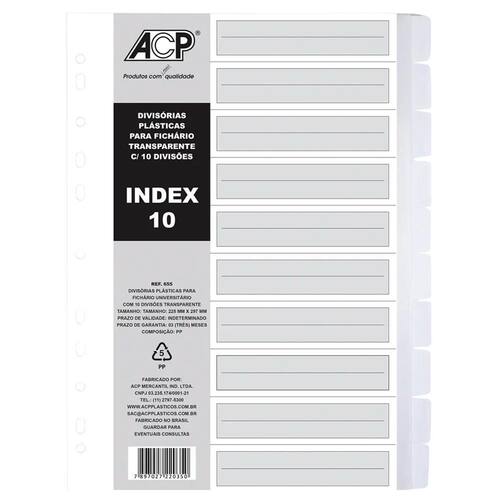 Divisória Plástica A4 Acp 10 Projeções Transparente As divisórias transparentes ACP com furação universitária são perfeitas para organizar seus documentos de forma eficiente. Com 10 divisões, você pode separar seus materiais por assunto, disciplina ou projeto. Compatíveis com diversos modelos de fichários e pastas, elas são essenciais para quem busca organização e praticidade. Pode ser em nossos fichários, fichários personnalité, pastas com grampo plástico, pastas com canaleta. Contém - 10 divisões - Marca: Acp - Modelo: Universitária - Referência: 655 - Transparente - Tamanho: A4 215 x 297mm - Composição: Polipropileno Marca: Não Informado Ean: 7897027220350