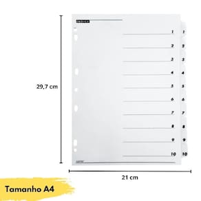 - Marca: Artik - Divisórias com 10 divisões - Possui visor para etiquetas de identificação - Furação universal - Totalmente reciclável e durável - Formato: A4 - Medidas: 297 x 210 mm Comprimento x Largura - Material: Papel Marca: Não Informado Ean: 7894114001045