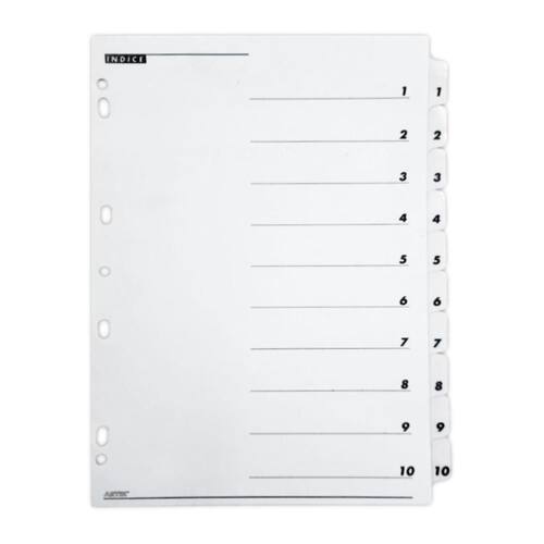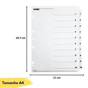 - Marca: Artik - Divisórias com 10 divisões - Possui visor para etiquetas de identificação - Furação universal - Totalmente reciclável e durável - Formato: A4 - Medidas: 297 x 210 mm Comprimento x Largura - Material: Papel Marca: Não Informado Ean: 7894114001090
