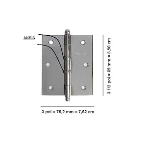 DobradiA 3 1/2 x 3 cromada com anel tolemat pino bola jogo cartela 3 peças + parafusos 700521 Jogo de dobradiças 3 1/2 x 3 polegadas com anéis e pino bola. Cada unidade corresponde a uma cartela com 3 dobradiças com anéis + parafusos para fixação. Medidas da dobradiça aberta: 89 mm altura x 76,2 mm largura x 1,7 mm espessura. Pode ser em portas ou janelas, podendo ser de madeira ou metálicas. Marca: tolemat Acabamento: cromado Marca: Não Informado Ean: 7891507005215