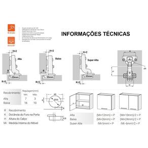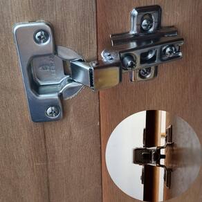 A Dobradiça tem a montagem simples, realizada através do deslizamento da dobradiça sobre o calço, que possui regulagem lateral vertical e horizontal para melhor alinhamento das portas e é fixada no calço de fixação no sistema slide-on deslizante