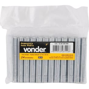 Medida da dobradiça (pol): 2 Material/acabamento da dobradiça : Ferro zincado Produto: Dobradiça | Marca: Vonder | Peças incluídas: Dobradiça | Unidades por kit: 1 Ean: 7893946485504