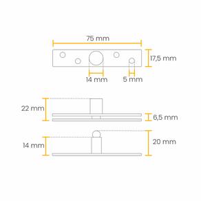 Material: Inox de alta resistência. Capacidade: Suporta até 120 kg. Acompanha: Buchas e parafusos para fácil instalação. Embalagem: Cada caixa contém 02 conjuntos. Medidas: Comprimento de 75mm, altura de 22mm e espessura de 6,5mm (referente à parte fixa).