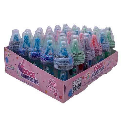 O Doce Mordedor é um pirulito em formato de anel que une praticidade e muito sabor! Com sabores irresistíveis de morango, mirtilo, maçã e uva, é perfeito para festas, lembrancinhas ou para deixar qualquer momento mais gostoso. As crianças adoram usar e saborear ao mesmo tempo!