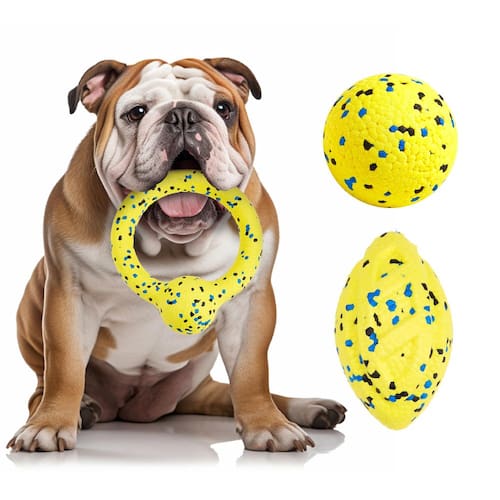 - ??Materiais alternativos ecológicos? Os brinquedos de rebocador Kimee para cães, conjunto de presente interativo para cães grandes e médios, brinquedo de puxar durável, bola amarela feita de material de ETPU tem características leves e de alta elasticidade e pode resistir a mordidas extremas de cães durante o jogo, o que é muito adequado para animais de estimação agressivos.