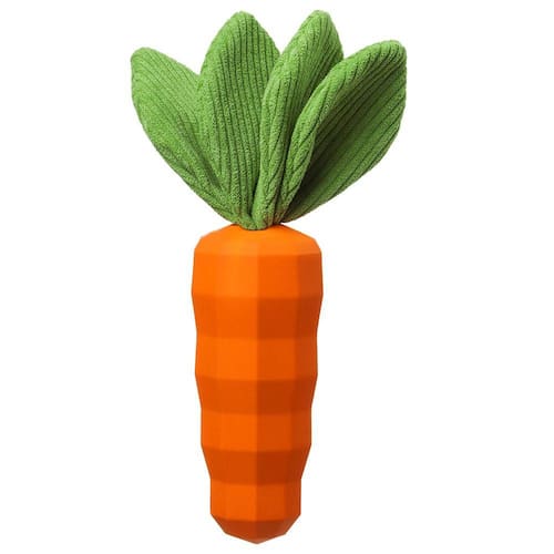 - Folhas verdes feitas de pelúcia não recheada com papel enrugado no interior. Corpo de cenoura laranja feito de borracha l. As dimensões do brinquedo são 9 pol* 1,8 pol. É adequado para cães médios com cerca de 30 a 60 libras, não para cães extras. ?Embora os brinquedos para cães sejam resistentes, não há brinquedos indestrutíveis, a supervisão adequada também é recomendada.?