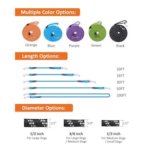 - Vários tamanhos e diâmetros. Coleira longa para cães: 3 m, 16 pés, 30 pés, 50 pés e 30 m, vários tamanhos podem atender a diferentes propósitos de treinamento. Nossa coleira para cães está disponível em diâmetro 1/3", 3/8", 1/2". O diâmetro de 0,6 cm pode atender cães pequenos, gatos ou outros animais pequenos. O diâmetro de 9,5 mm e 1,27 cm é a melhor escolha para treinamento de trelas para cães grandes ou médios.