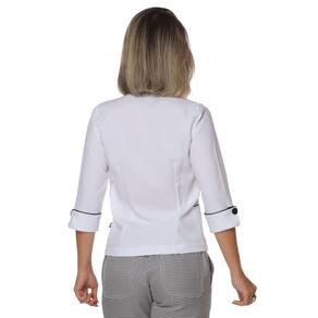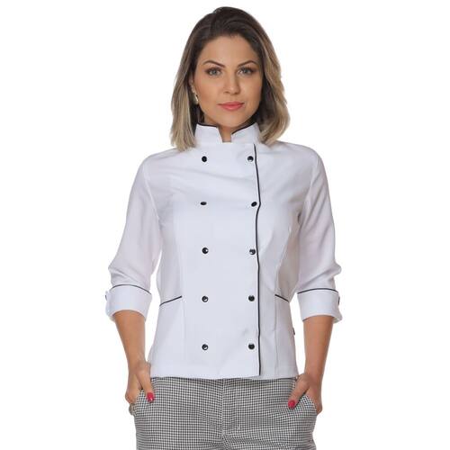 A Dolmã Chef de Cozinha feminina ACINTURADA manga 3/4 é produzido em tecido Oxford Premium. Fechamento frontal com botões de pressão para a rápida remoção da vestimenta em caso de imprevistos. Essa peça foi desenvolvida, pensando naqueles profissionais que atuam nas cozinhas com temperatura elevada. Ideal para Chefes de Cozinha, que trabalham em eventos Gourmet e querem se destacar no seu espaço. Possui dois bolsos laterais. A Dolmã possui gola tipo Padre, que deixa você com mais estilo. Costurado com máquinas eletrônicas. Acabamento com viés preto, o que torna a peça mais resistente e da um toque de elegância para o usuário. Tecido leve, confortável, fácil de lavar e seca rapidamente. Baixo grau de amarrotamento. Destaca-se como a melhor proposta em relação ao custo-benefício, e sua composição 100% poliéster proporciona bem-estar e boa apresentação. É fabricado em tecido 100% poliéster. Veja seu tamanho ideal na tabela de medidas. Referência: 413GA12