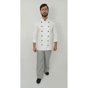 Introduza elegância e funcionalidade ao uniforme dos profissionais da culinária com a Dolma Masculina Chef de Cozinha de Manga 3/4 em tecido de brim na clássica cor branca. Esta peça foi projetada para oferecer um visual moderno e prático, atendendo às necessidades dos chefs e profissionais da cozinha. O fechamento em botões frontais cria um efeito transpassado ao abotoar, proporcionando um toque contemporâneo à dolma.