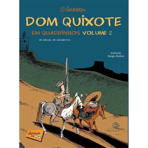Neste segundo volume da versão em quadrinhos da obra clássica de Cervantes, D. Quixote, o Cavaleiro da Triste Figura, sai novamente para conquistar o mundo ao lado de seu escudeiro, o fiel Sancho Pança. Juntos, enfrentarão leões selvagens, grutas fantasmagóricas, cavaleiros misteriosos e o sarcasmo das pessoas, em uma obra repleta de humor e lirismo, criada pelo talentoso Caco Galhardo. A versão em quadrinhos do clássico de Cervantes foi composta também em dois volumes, em dois momentos distintos, tal qual o processo de concepção da obra-matriz, à época. Cervantes publicou seu Dom Quixote em 1605. Após dez anos de sucesso do livro, lançou o segundo volume (1615), com novas aventuras do cavaleiro andante e seu fiel escudeiro.