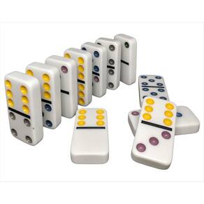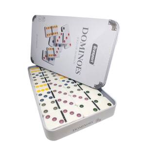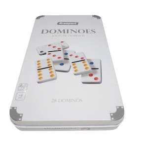 Características do Produto: . 28 Peças Resinadas: Feitas para durar, com alta resistência e firmeza. . Design Atraente: Peças brancas com pontos coloridos para fácil identificação. . Estojo Metálico: Compacto e resistente, protege suas peças onde quer que você vá. . Tamanho do Estojo: 19 cm x 11 cm x 3 cm, fácil de transportar e armazenar. . Garantia de Qualidade: Peças no tamanho padrão e garantia do vendedor de 90 dias. . Leve para casa o nosso Jogo de Dominós e transforme qualquer ocasião em um momento memorável. . Perfeito para presentear ou para adicionar à sua coleção de jogos, este conjunto é a combinação ideal de qualidade e diversão.