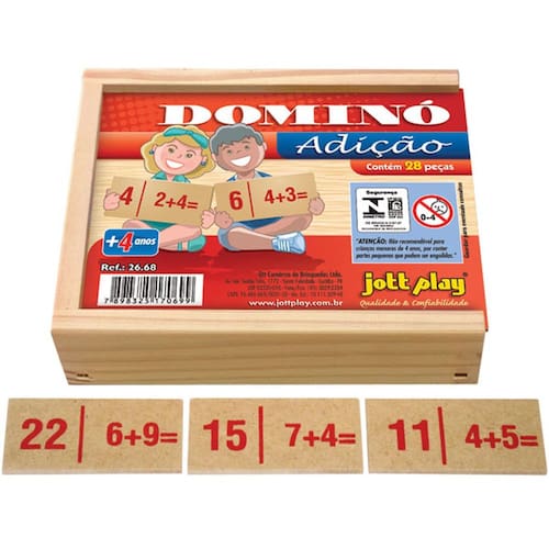 - DOMINÓ DE ADIÇÃO Descrição do Produto: Uso: Formação de sequências, relacionando a operação com o seu resultado. Desperta a atenção do aluno para a necessidade de operacionalizar mentalmente inclusive com duplas possibilidades, pois podem-se colocar as peças em qualquer das extremidades. Desenvolve: Raciocínio matemático, atenção, cálculo mental, fixação do conteúdo, integração em grupo. Composição de cada jogo : 28 peças de madeira, com impressão de operações e seus resultados. Acondicionados em caixa de madeira medindo 05x9x27cm. INMETRO CE-BRI/003N 3107-07 NM300/2002 Ean: 7898325170699