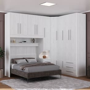 * Colchão, cama e itens de decoração não estão inclusos. Imagens meramente ilustrativas. Ideal para casais que procuram de um dormitório com bom espaço interno e o mesmo tempo compacto para os ambientes das grandes metrópoles. - 01 Guarda-roupa de 4 e 3 gavetas modelo 1249; - 01 Armário de Canto Sextavado modelo 1231; - 01 Guarda-roupa de 1 porta e 3 gavetas com mesa de cabeceira embutida modelo 1416 direito; - 01 Maleiro de casal 4 portas modelo 1226; - 01 Painel para cama Box de casal modelo 1217.