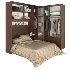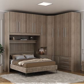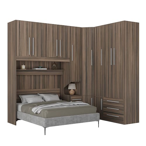 * Colchão, cama e itens de decoração não estão inclusos. Imagens meramente ilustrativas. Ideal para casais que procuram de um dormitório com bom espaço interno e o mesmo tempo compacto para os ambientes das grandes metrópoles. - 01 Guarda-roupa de 4 e 3 gavetas modelo 1249; - 01 Armário de Canto Sextavado modelo 1231; - 01 Guarda-roupa de 1 porta e 3 gavetas com mesa de cabeceira embutida modelo 1416 direito; - 01 Maleiro de casal 4 portas modelo 1226; - 01 Painel para cama Box de casal modelo 1217.