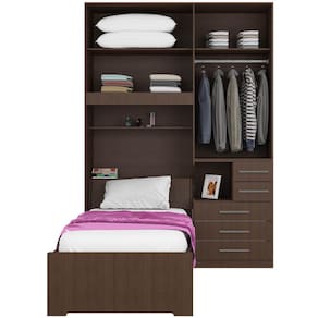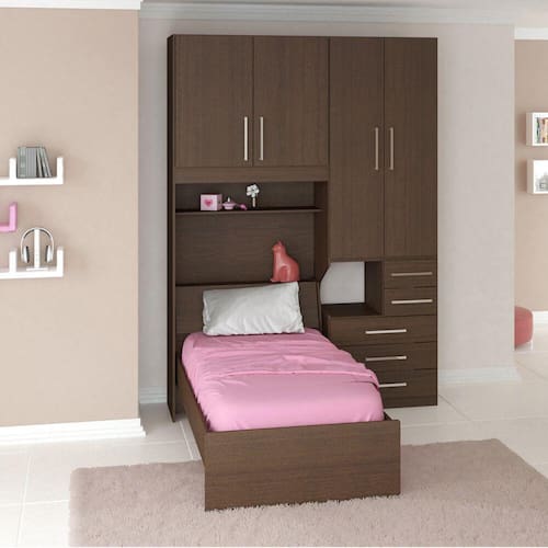 * Cama, colchão e itens de decoração não estão inclusos. Imagens meramente ilustrativas. Design moderno e adequado para quartos que não sejam muito amplos como é a maioria dos ambientes nas grandes metrópoles. Nossa opção de dormitório de solteiro com cama embutida. Ele ideal para quem quer praticidade e conforto pois tem grande aproveitamento do espaço do quarto com seu maleiro e a cama baú. - 01 Guarda-roupa de 2 portas e 5 gavetas com mesa de cabeceira embutida modelo 1224 direito; - 01 Maleiro de solteiro 2 portas modelo 1221; - Puxadores 256mm. DIMENSÕES DO PRODUTO MONTADO - ALTURA 240 CM; - LARGURA 172 CM; - PROFUNDIDADE 51CM NOS ARMÁRIOS (Não esqueça de considerar o comprimento da sua cama, mínimo de 190cm). Vão livre de 95cm de comprimento por 110cm de altura abaixo do maleiro. Para compras de dormitórios sem a cama inclusa lembre-se sempre de verificar se a cabeceira da sua cama cabe neste espaço. Embora a cama não acompanhe, informamos que o painel, o frontal e prateleira localziados abaixo do maleiro são inclusos (pois fazem parte do maleiro e não da cama). Atenção: Não nos responsabilizamos, no ato da entrega, por desmontagens, subir escadas/elevadores ou transporte por guincho para apartamentos. Eventuais despesas são de responsabilidade do cliente. Confira as dimensões deste produto e certifique-se de que o mesmo passará normalmente por supostos elevadores, portas, escadas e/ou corredores de sua moradia.