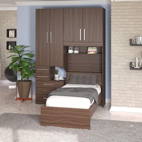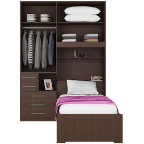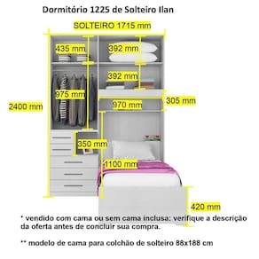 * Cama, colchão e itens de decoração não estão inclusos. Imagens meramente ilustrativas. Design moderno e adequado para quartos que não sejam muito amplos como é a maioria dos ambientes nas grandes metrópoles. Nossa opção de dormitório de solteiro com cama embutida. Ele ideal para quem quer praticidade e conforto pois tem grande aproveitamento do espaço do quarto com seu maleiro e a cama baú. - 01 Guarda-roupa de 2 portas e 5 gavetas com mesa de cabeceira embutida modelo 1224 esquerdo; - 01 Maleiro de solteiro 2 portas modelo 1221; - Puxadores 256mm. DIMENSÕES DO PRODUTO MONTADO - ALTURA 240 CM; - LARGURA 172 CM; - PROFUNDIDADE 51CM NOS ARMÁRIOS (Não esqueça de considerar o comprimento da sua cama, mínimo de 190cm). Vão livre de 95cm de comprimento por 110cm de altura abaixo do maleiro. Para compras de dormitórios sem a cama inclusa lembre-se sempre de verificar se a cabeceira da sua cama cabe neste espaço. Embora a cama não acompanhe, informamos que o painel, o frontal e prateleira localziados abaixo do maleiro são inclusos (pois fazem parte do maleiro e não da cama). Atenção: Não nos responsabilizamos, no ato da entrega, por desmontagens, subir escadas/elevadores ou transporte por guincho para apartamentos. Eventuais despesas são de responsabilidade do cliente. Confira as dimensões deste produto e certifique-se de que o mesmo passará normalmente por supostos elevadores, portas, escadas e/ou corredores de sua moradia.