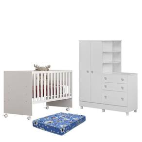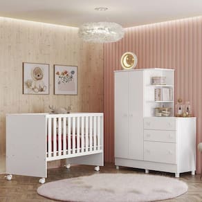 Dormitório Doce Sonho Guarda Roupa Com Cômoda Com Pés, Berço Reto Branco E Colchão Physical - Qmovi Branco Dormitório Doce Sonho Guarda Roupa com Cômoda com Pés, Berço Reto e Colchão Physical - Qmovi O Dormitório Infantil Doce Sonho foi pensado para quem precisa de otimização no espaço, o Guarda Roupa com Cômoda é perfeito para acomodar os objetos do bebê com praticidade e comodidade. Organize tudo o que você precisa em um só lugar com este móvel moderno e funcional. Já o Berço Doce Sonho Reto foi projetado especialmente para oferecer conforto e ao bebê. Com um design clássico e delicado, ele garante beleza e aconchego para o ambiente. E para completar o Colchão Baby Physical da Ortobom fica responsável pelas noites tranquilas e agradáveis de sono. Uma escolha de amor e cuidado com o seu pequeno. Guarda Roupa com Cômoda Infantil Doce Sonho 2 Portas e 3 Gavetas - Qmovi - Estrutura em MDP - Pintura UV - 2 Portas - Dobradiças metálicas - 3 Gavetas - Corrediças metálicas - Cabideiro oblongo metálico - Puxadores em plástico poliestireno - Cômoda e nichos acoplados no guarda-roupa - Pés em PVC - Maior organização e praticidade