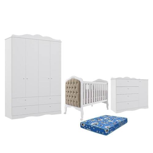 Dormitório Guarda Roupa, Cômoda e Berço Harmonia com Capitonê e Colchão Physical - Permóbili Baby