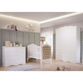 O Dormitório inclui o Guarda-Roupa e a Cômoda , além do Berço Harmonia. O Guarda-Roupa tem 4 portas, 4 gavetas com corrediças telescópicas, cabideiro em alumínio, prateleiras e nichos. Feito de 100% MDF com pintura UV e puxadores de plástico ABS, possui moldura provençal decorativa. A Cômoda tem 4 gavetas, uma porta com prateleira interna e cabideiro ajustável, bordas arredondadas e pintura atóxica. O Berço Harmonia é feito de MDF, certificado pelo INMETRO, com duas regulagens de altura para o estrado, grades laterais fixas, 4 rodízios (2 com trava), bordas arredondadas, varão mosquiteiro e barra de proteção para transformá-lo em mini cama. E para completar o Colchão Baby Physical da Ortobom vai garantir noites mais confortáveis e tranquilas que toda mamãe busca para seu filho.