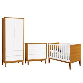 Dimensões: Tamanho do Guarda-Roupa (L x A x P): 90 x 205 x 46 cm Tamanho da Cômoda (L x A x P): 91 x 91 x 46 cm Tamanho do Berço (L x A x P): 135 x 97 x 76 cm