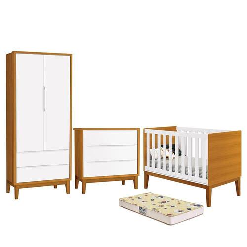 Dormitório Infantil Classic 2 Portas, Cômoda, Berço com Pés Amadeirado e Colchão D18 - Reller Móveis - Branco